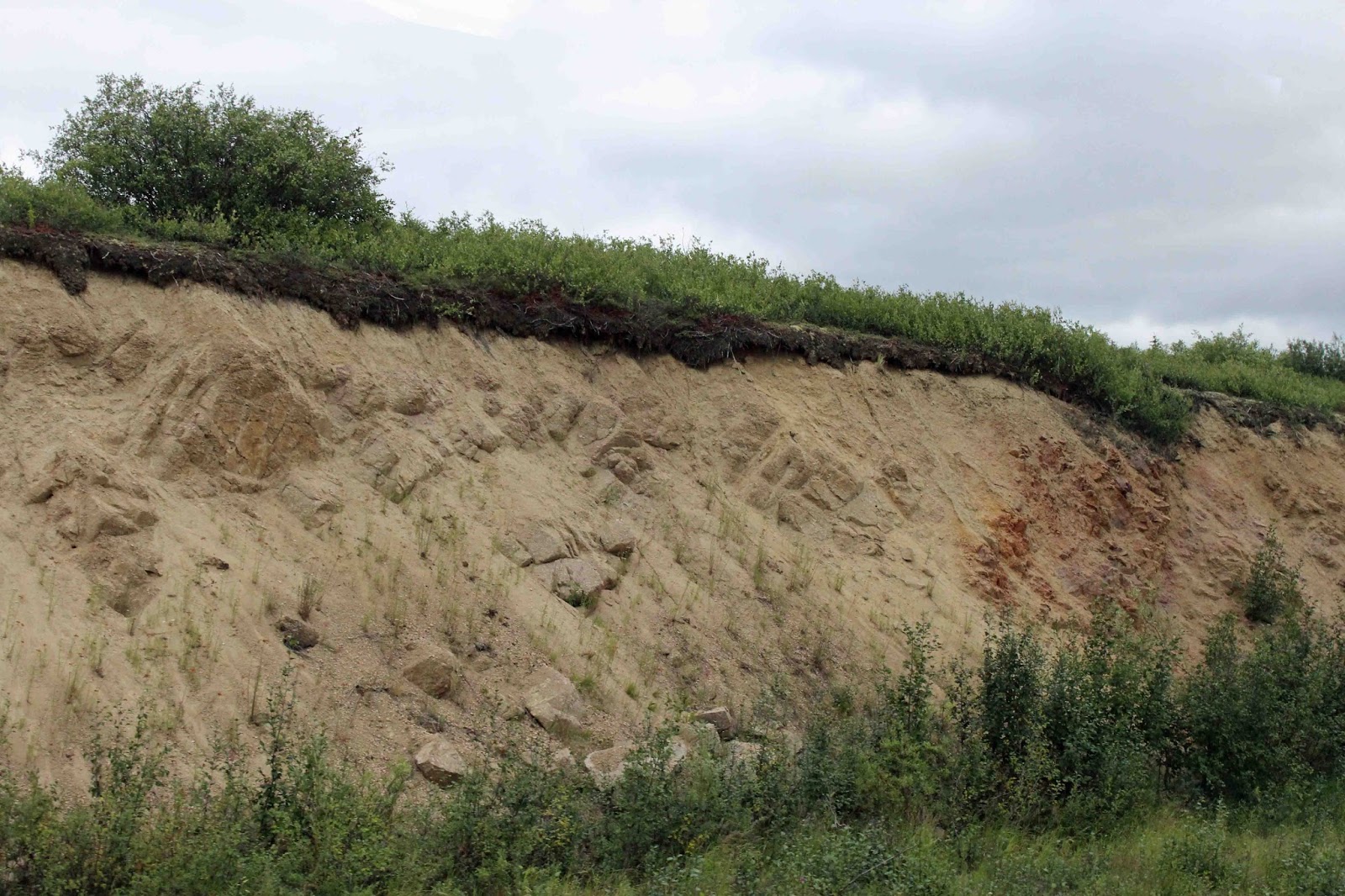Note the top living layer, that below was once frozen permafrost layer. Now thawed the remnants are dry and powdery will erode away until the living layer again covers it.